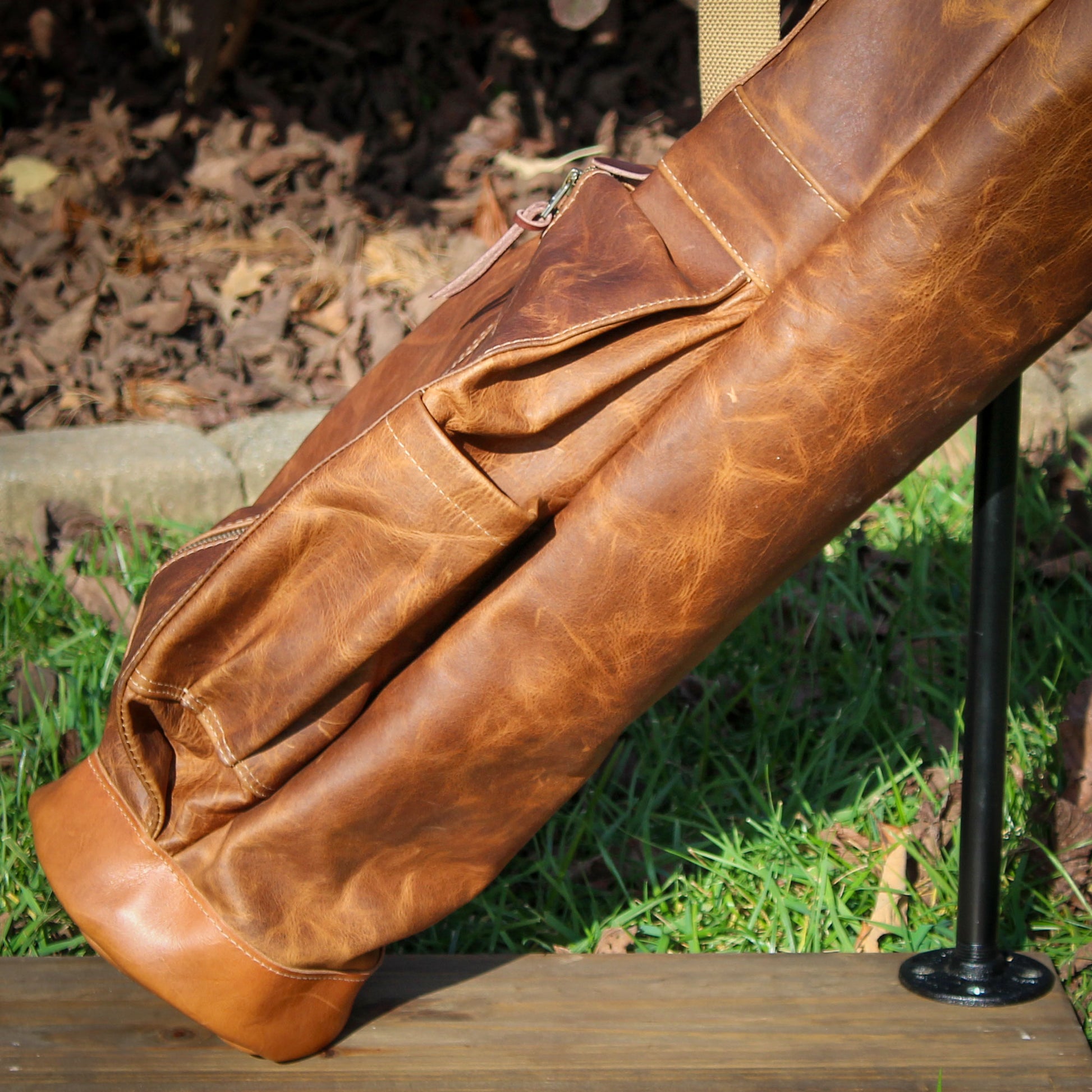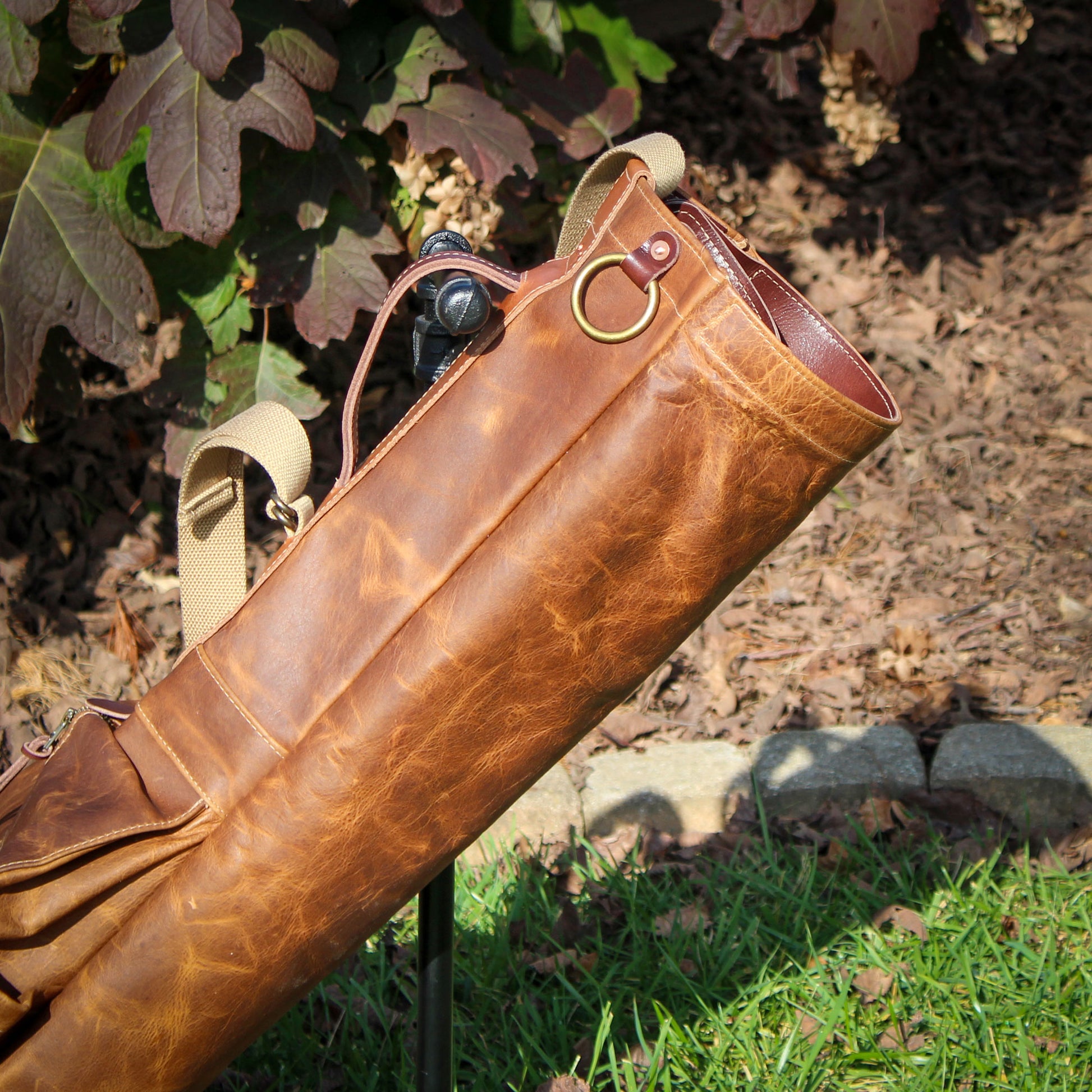Expertly designed for the avid golfer, our Original Steurer Sunday Golf Bag is perfect for those who walk and carry a full or partial set of clubs. With a 7-1/2" unstructured design, this bag features a front exterior pocket with interior pocket for your accessories, a leather snap loop for keys, and a 47” shoulder strap made with durable cotton webbing. The unstructured top has a single club divider, a sleeve for your dowel rod to add structure and heavy duty saddle leather reinforcement, ensuring comfort and durability with or without a spine. However, each bag features a Spine Sleeve (you supply the 3/8" dowel ... the bag ships folded).